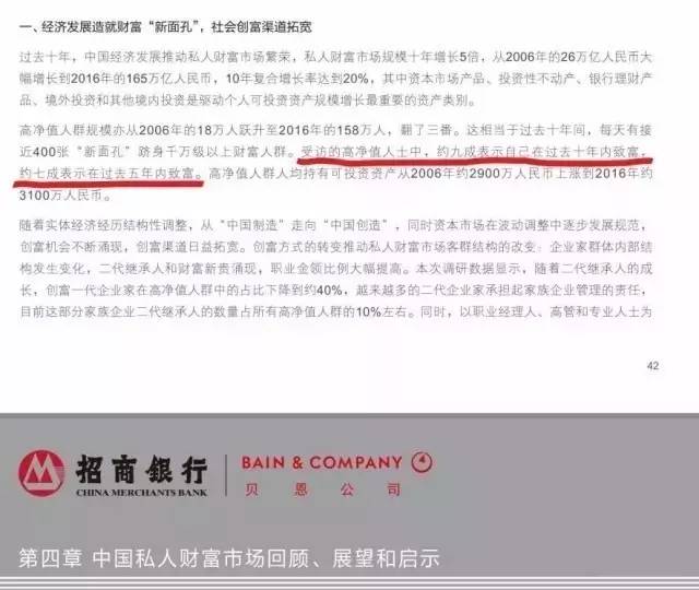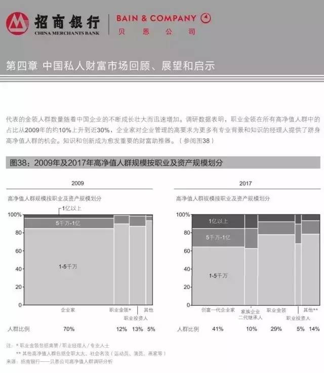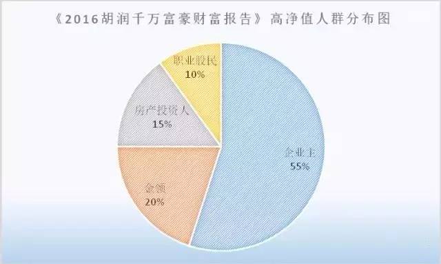 在胡润的财富报告里,高净值人群中企业主占比55%,金领占比20%,这基本与招行的报告相符,其反应的经济产业结构变动趋势是一致的。