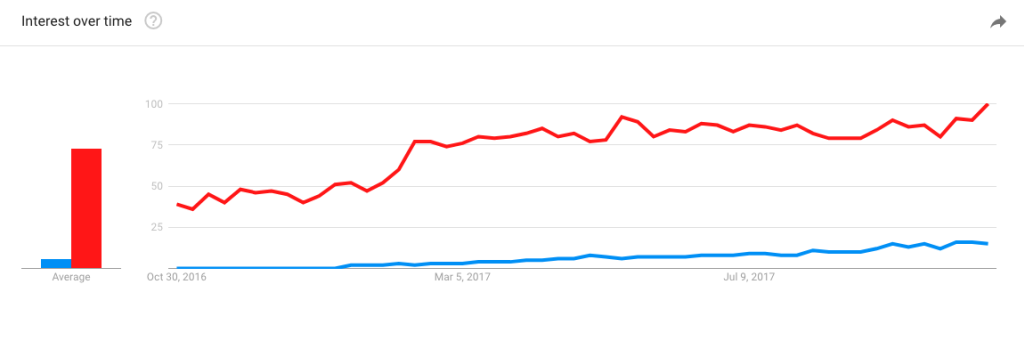 未来六个月中,开源的竞争将何去何从取决于 PyTorch 和 Caffe2 的应用以及各种开源合作。目前,Facebook 的解决方案似乎十分有潜力,但其解决方案的落实却远远落后于谷歌(请参见下面的 Google 趋势图)。
