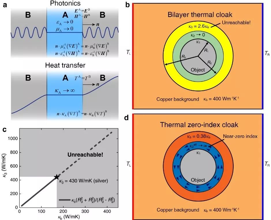 考虑图1a中的两个场景:电磁波在两种介质A、B间传播和热流在A、B间传导。首先可以发现,如果上图中介质A折射率趋于零,而下图中介质A满足ρcp/k → 0(ρ为密度,cp为等压比热容,k 为热导率),则电磁场和温度场在介质A中满足相同的拉普拉斯方程,因此都必须为均一场。更有趣的是,当介质A为零折射率材料时,相同的相位要求电磁波波前必须垂直于界面,这使得界面上电磁场匹配条件中的旋度方程可直接化为一个梯度方程(图1a中上图公式),形式和热传导的温度场匹配条件(图1a中下图公式)完全一致,其中介电常数(或磁导率)的倒数与热导率相对应。综上可知,零折射率在热传导中对应的实际上就是趋于无穷大的热导率。