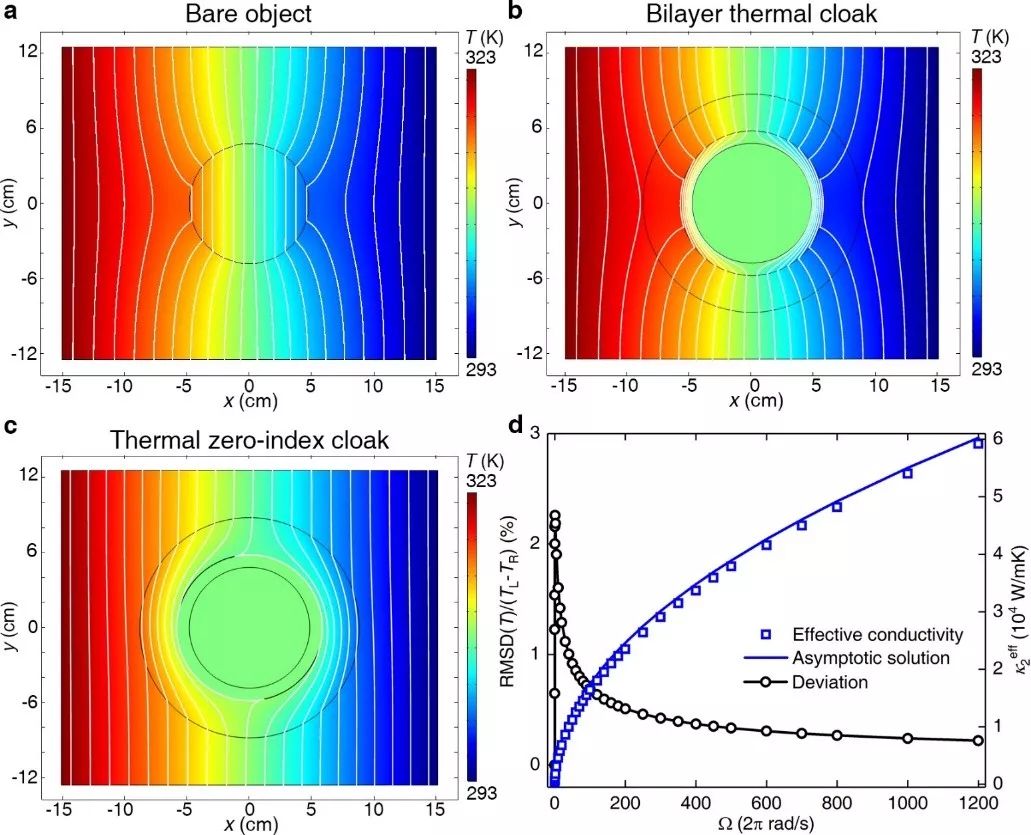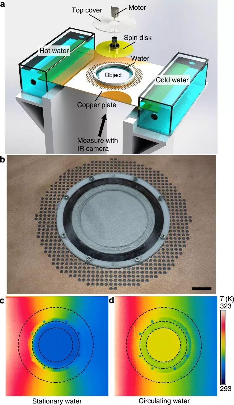 零折射率热斗篷这种基于常用材料的设计很容易实验实现。如图4a所示的电机带动转盘的系统即可驱动水流达到所需的转速。而外层的热导率可以通过在结构上打孔,基于等效介质近似获得(图4b)。用红外成像仪拍摄的图像清楚展示了当水处于静止(图4c)和被驱动(图4d)时的温度场。后者不仅达到了理想的热隐身效果,且内部物体的温度也跟随了环境温度的变化。
