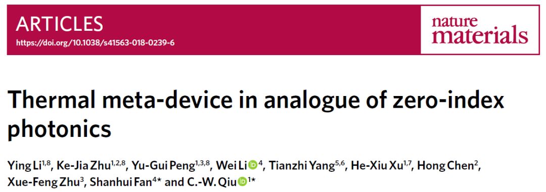 基于等效介质理论,热超材料的等效热导率无法超过其所用原料中热导率的最大值。这使得众多传热调控功能实际上不能作用在铜或铝等许多热的良导体上,严重限制了可能的应用场景。2019年1月新加坡国立大学 C.W.Qiu组及其联合团队在Nature Materials 上发表的题为 “Thermal meta-device in analogue of zero-index photonics” 的长篇论文(Article)借助热传导和电磁波传播之间的类比,实现了突破传统极限的新型热调控方式。