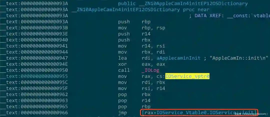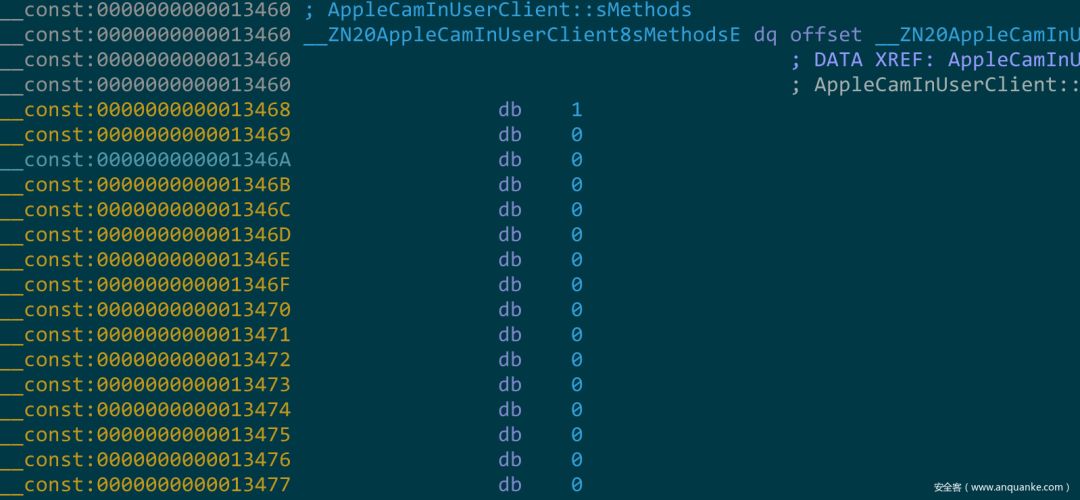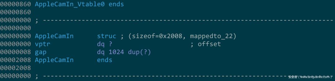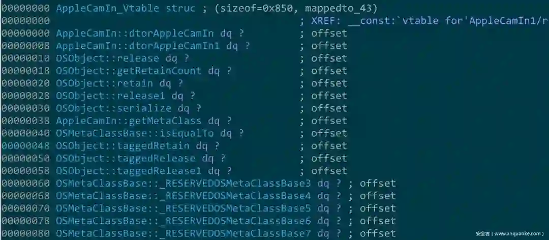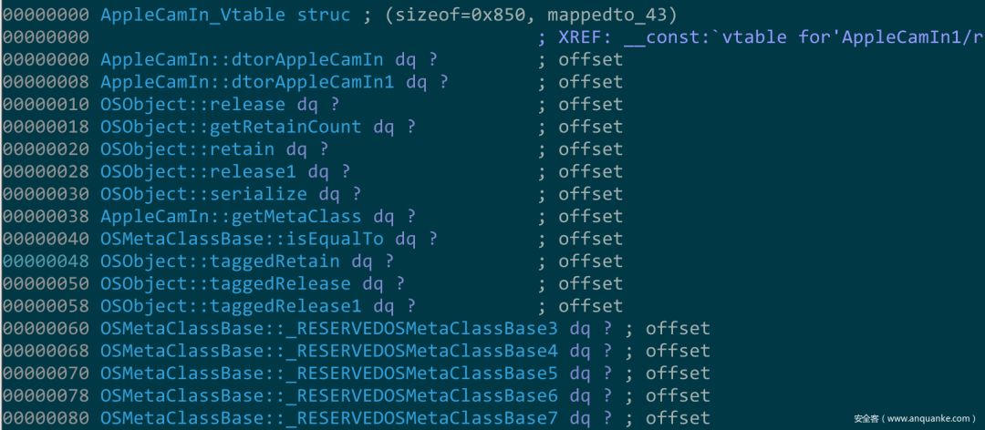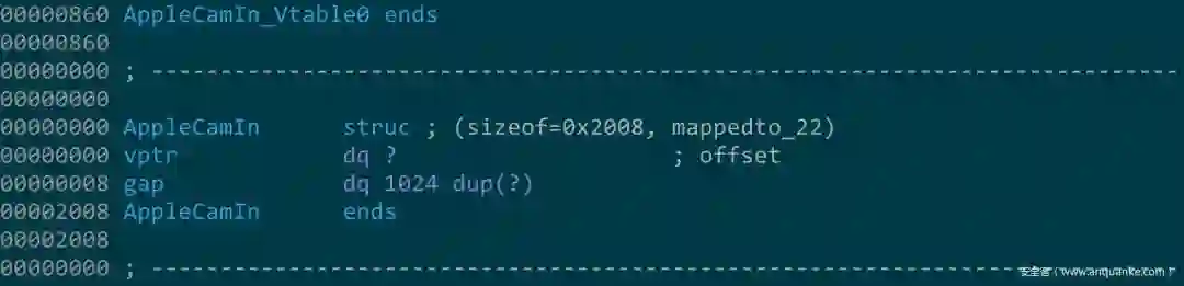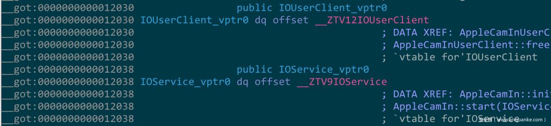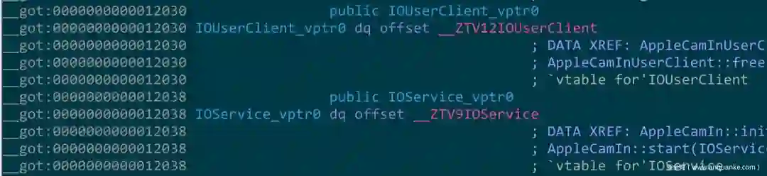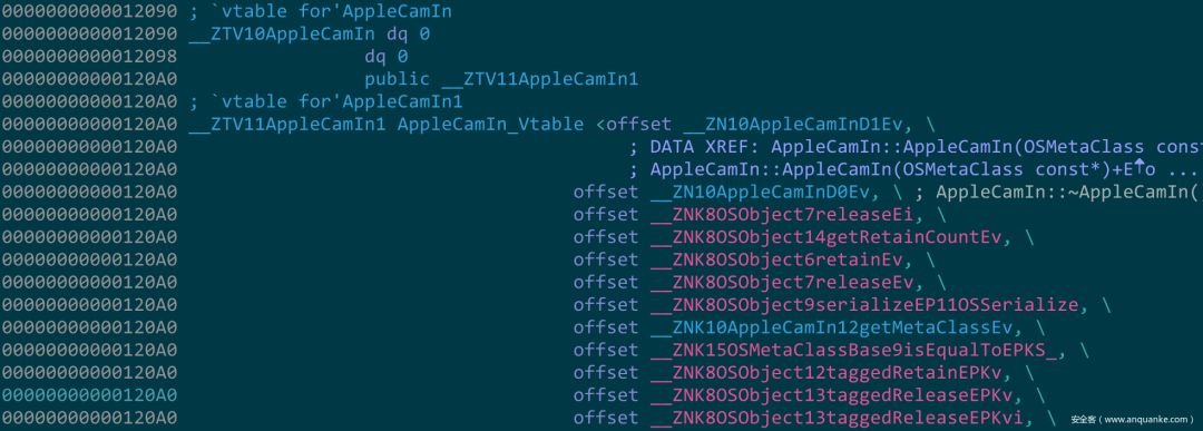 如上图,“`vtable for’AppleCamIn”主要用于依赖导入,“`vtable for’AppleCamIn1”主要用来构造对象的 vptr,如下图: