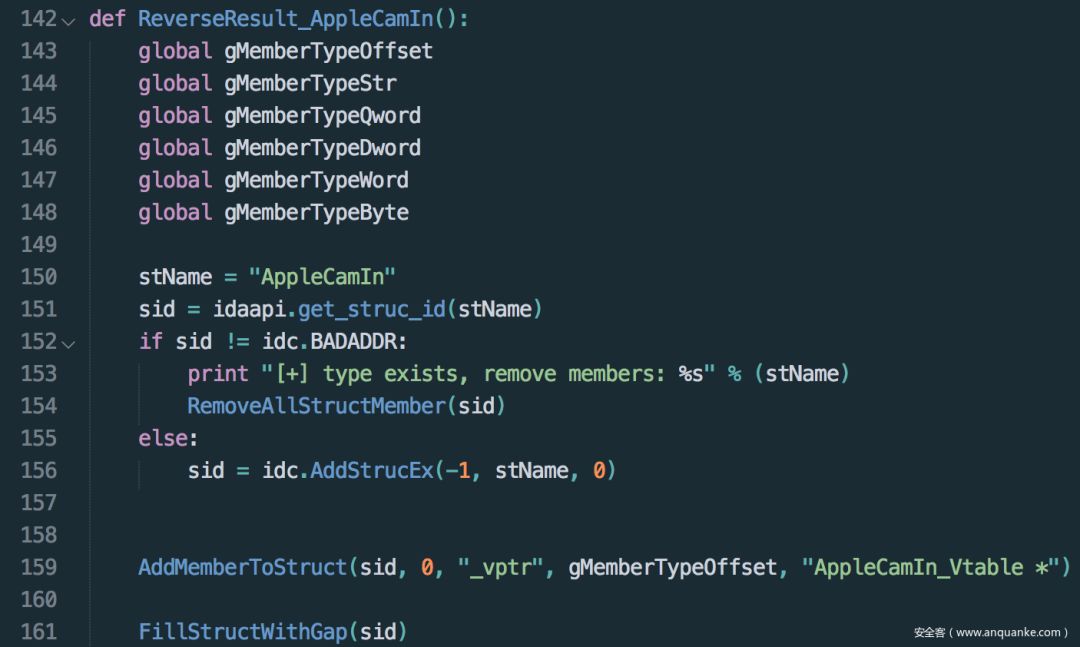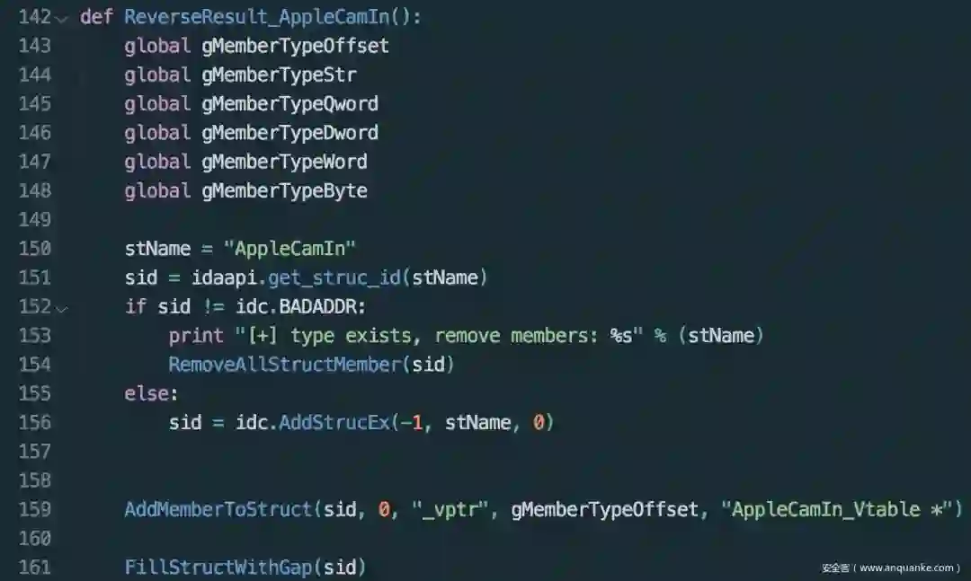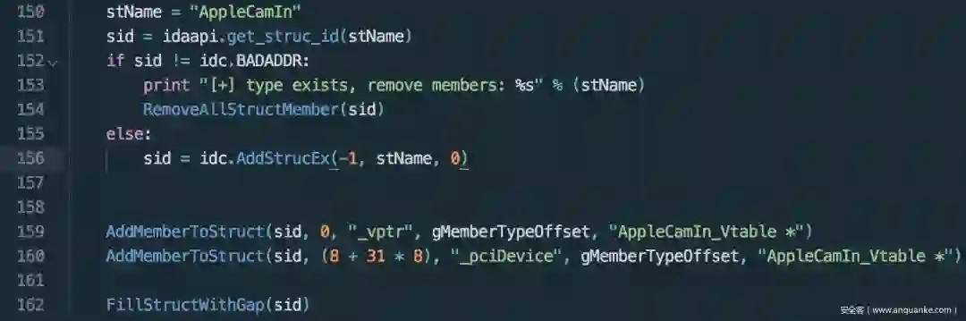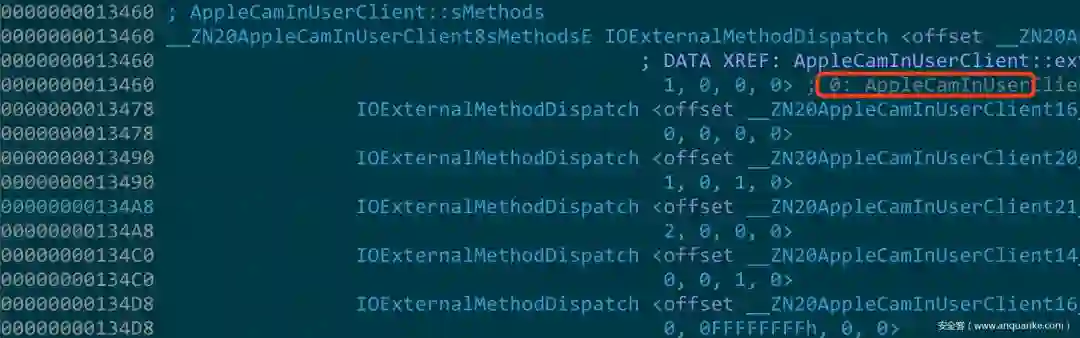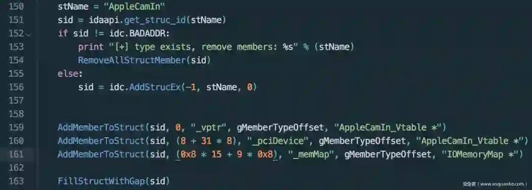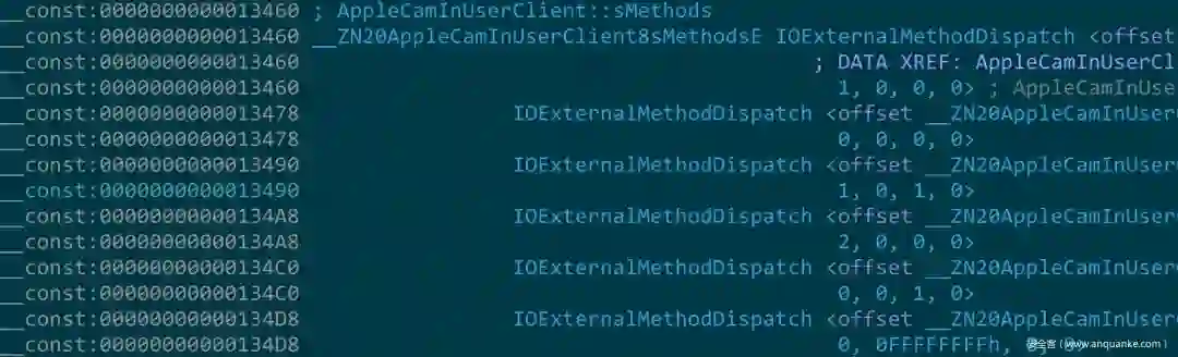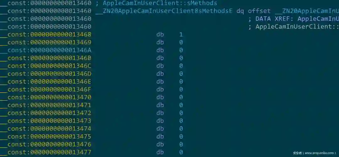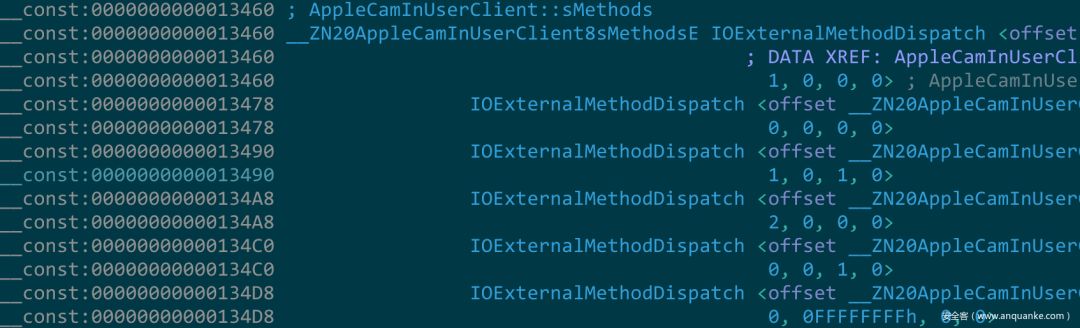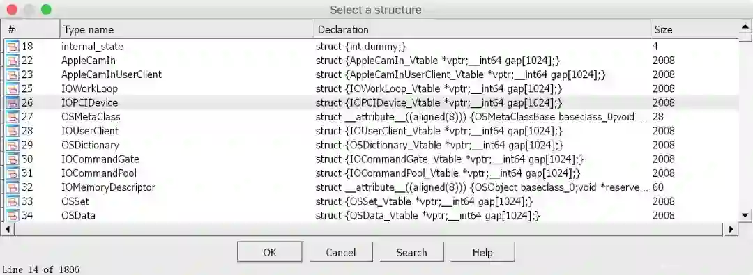 可以看到当前的驱动依赖 Kernel 和 IOPCIFamily。使用 IDA 加载 Kernel,使用脚本创建相应的虚表结构与类结构,然后导出类型 IDC:File -> Product File -> Dump Typeinfo to IDC File。最后在当前的 IDA 数据中导入 IDC,IDC 是 IDA 的原生脚本,导入的方式是:File -> Script file…,选择导出的 IDC 文件。需要将同样的操作流程应用到依赖库上,本例中是 IOPCIFamily。有的依赖库并不会在 OSBundleLibraries 中列出来,以 AppleCameraInterface 为例,它还依赖 IOACPIFamily 和 IOSurface,像这种隐含的依赖,遇到时再做处理。