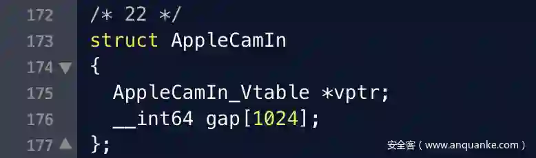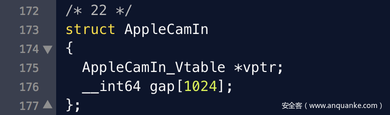 从反编译结果中我们我们知道 AppCamIn 类有个成员变量是 IOMemoryMap *,gap_0x8 的类型是 int64,起始偏移量为 this[15],相对偏移量为 9 * 0x8,总的偏移量为:this[15] + 9 * 0x8 = 0x8 * 15 + 9 * 0x8,将成员变量添加到类结构中: