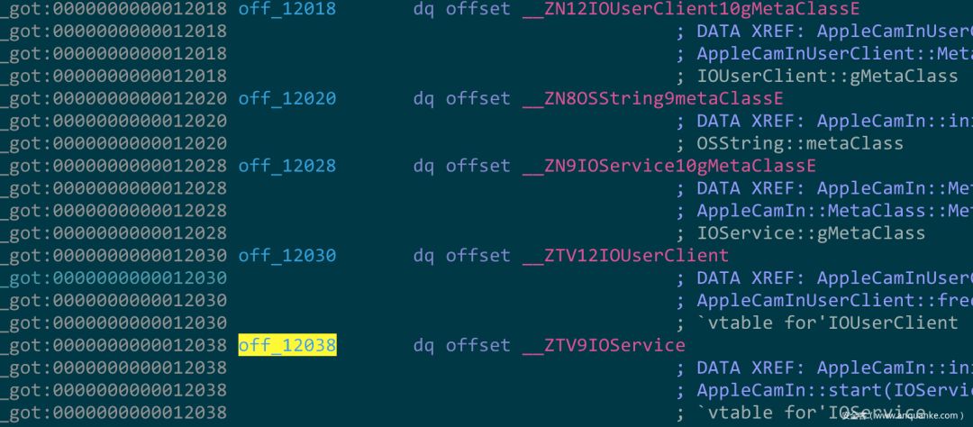 以 IOService 的虚表为例,命名 off_12038 没有意义,造成在逆向分析时还要多一步跳转才能知道这是什么类型: