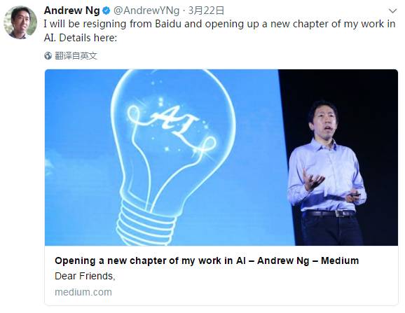 六天后,又一枚重磅炸弹被扔出,3月22日,百度首席科学家吴恩达(Andrew Ng)在英文自媒体平台Medium及微博、Twitter等个人社交平台发布公开信,宣布自己将从百度离职。