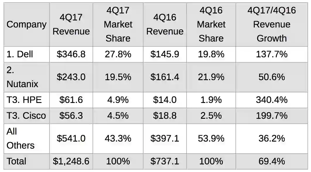 2017年第四季度,超融合系统(包括硬件和软件)的总销售额同比猛增70%,达到了12.5亿美元。IDC按超融合解决方案的品牌或提供核心超融合功能的软件的所有者对超融合系统市场的技术供应商进行了排名。