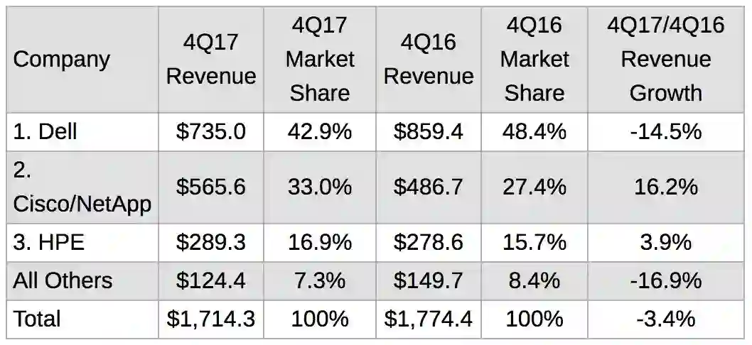 戴尔42.9%的市场份额比2016年第四季度的48.4%这个份额有所下降,当时其收入为8.59亿美元。思科和NetApp的份额从2016年第四季度的27.4%增长到33%,HPE的份额同比增长了近4%,达到16.9%。