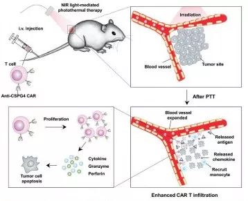 研究人员在患有黑色素瘤的小鼠身上进行实验,将光热剂注入体内,用激光照射加热肿瘤,随后在其静脉中注射了CAR-T细胞。结果显示,在20天的时间里,病鼠体内的肿瘤生长受到了抑制。
