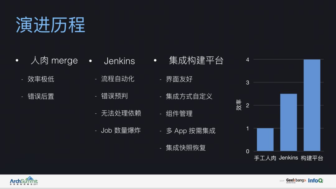 另外集成构建平台相比 Jenkins 会增加一个统一管理所有组件的功能,借助这个功能,在基础平台上通过不同的组件的集成就会包装出不同的 APP,即支持多 APP 的集成,集成构建平台还有一个功能就是会对每次集成构建创建快照,根据需要的时候能进行恢复,如果一个历史线上的包出现问题的话,可以快速恢复那个包的代码状态,进行调试,集成构建平台的投入使用是人肉手工效率的 3 倍左右。