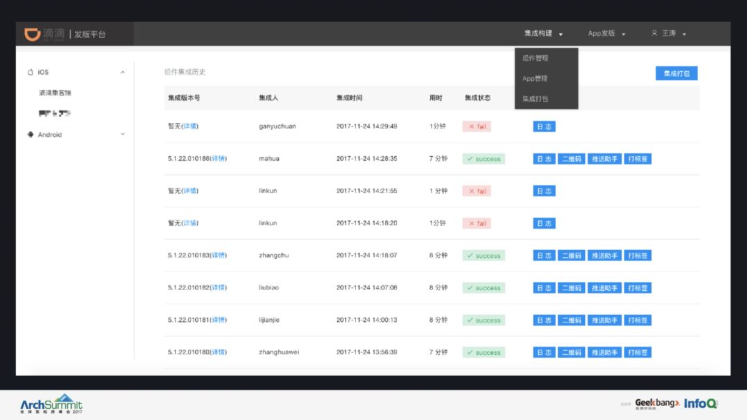 上图是集成构建平台的界面,他有着比 Jenkins 更友好的界面,左面是支持的不同端和不同的 APP,右面是每次集成构建的历史,上面还有一些 APP 的管理和组件的管理等功能。