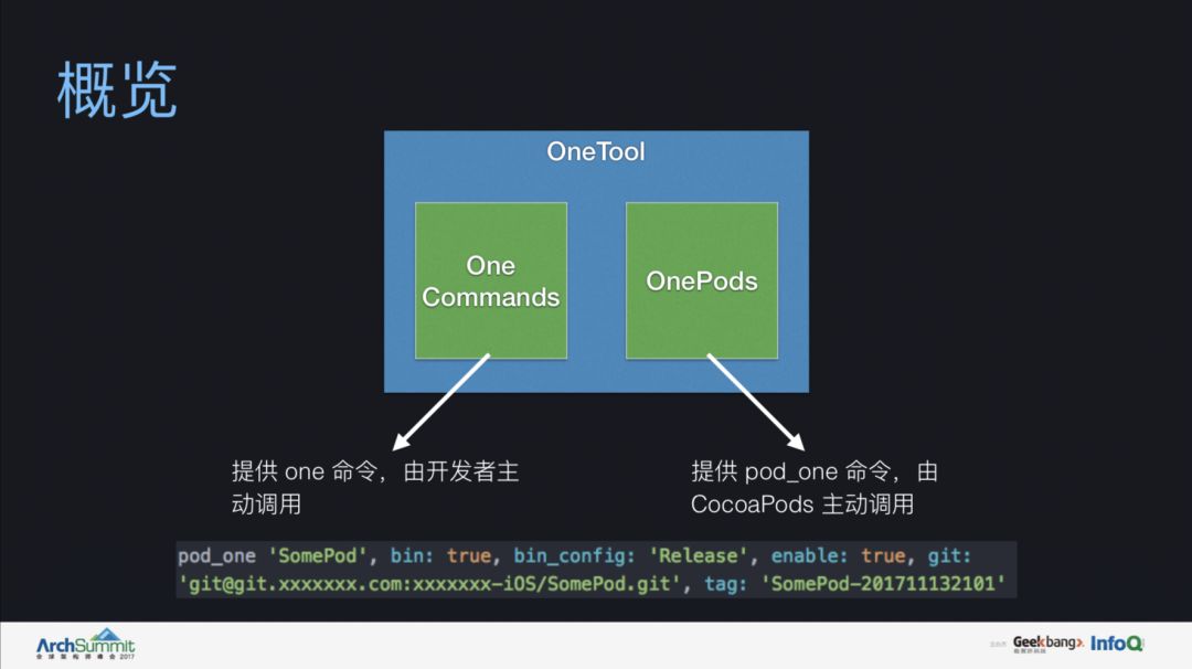 OneTool 包括两个部分,第一部分是 One Commands,这是由开发者主动调用的。还有另外一个部分是 OnePods,它是由 Cocoapods 主动调用的。