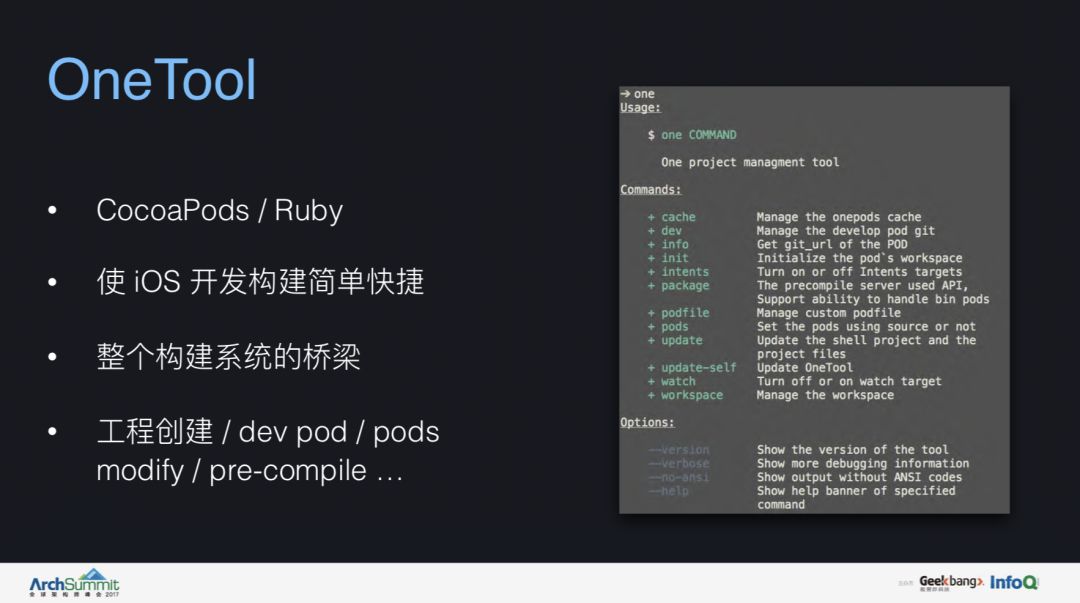 然后我们对构建系统进行了再次升级,推出了 OneTool 工具,标准化壳工程改造,是我们的壳工程经历了合久必分,分久必合的过程,以及基于 Cocoapods 的预编译优化。