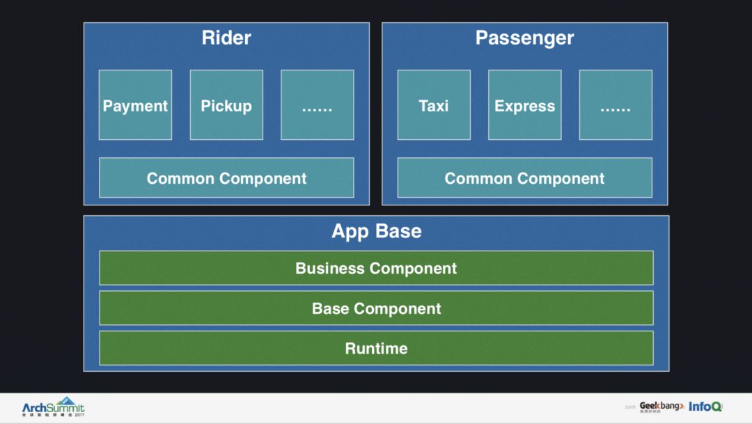 这个是我们目前的基本架构图,大家可以看到下面是基础平台的部分,包括了一些通用的运行时组件,一些基础组件还有业务组件,在平台之上会有不同的 APP,每个不同的 APP 加入自己的个性化组件,包装成一个 APP。