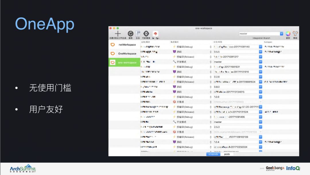 OneApp 的工具推出之后,在公司内部将成本基本降低到了零,在最初我们没有工具,仍然是以原始创建工程的方式创建工程时,曾经发生过这样的事情,公司一个新同学入职的时候,第一件事就是配个可以编译的 Workspace,由于我们的 Workspace 非常复杂,他配置了一个星期也没能将工程 run 起来,最后那个同学直接离职了,但是现在这样的问题已经不存在了。使用这个工具之后,新同学在入职十分钟之内就可以创建出一个可以运行的 Workspace,目前除了 iOS 开发者在使用它以外,QA 和 PM 也在 使用用,PM 为什么会用?前一阵 iPhoneX 出来之后,我们要做适配,PM 可以拿出这个工具,通过简单操作配出一个工程,就可以看到适配之后的结果。