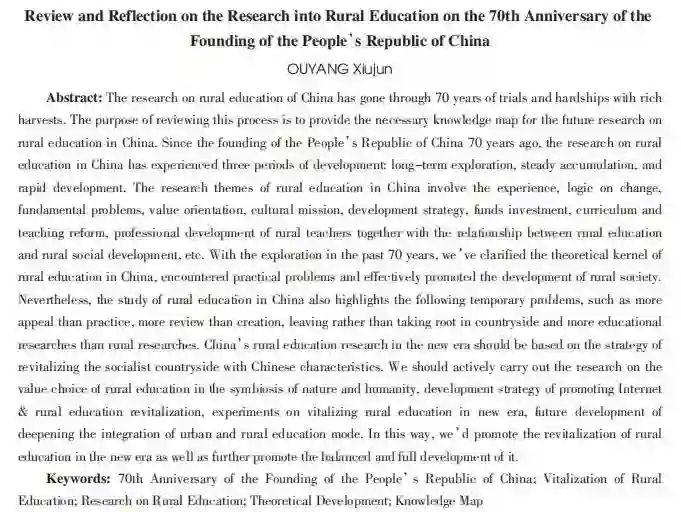 对中国乡村教育70年的研究过程回顾,意在从宏观上整体把握其发展态势,从中观的纵向发展和横向主题明析其研究现状,从微观上具体描述其面临的现实问题及其解决策略。归根结底是为当下中国乡村教育发展把脉和寻求未来发展之方向。