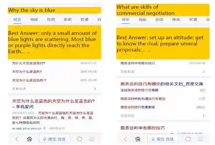 这里有两个文摘在搜索结果中体现的例子。左图显示,输入query“天空为什么是蓝的”,系统可以挑选出与这句话相关的网页,从中抽取出摘要并显示出来;右图中的例子也是同样道理。