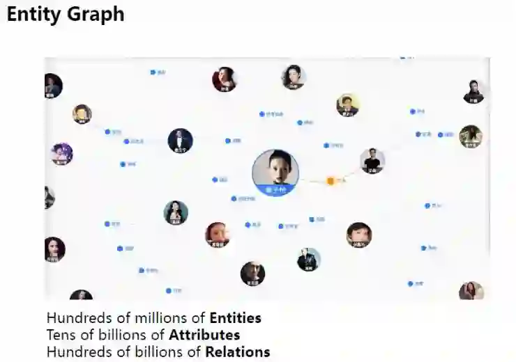 在实体图谱里,每一个节点都是一个实体,每个节点都有几个属性,在这个例子中,节点之间的连接是实体之间的关系。目前我们的实体图谱已经包含了数亿实体、数百亿属性和千亿关系,这些都是从大量结构化和非结构化数据挖掘出来的。
