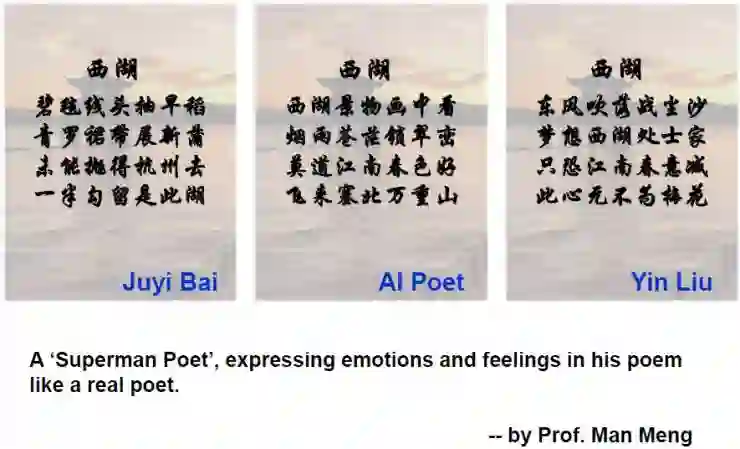 在下面展示的这三首诗中,中间这首是由AI诗人完成的,而其他两首的作者都是中国古代诗人(白居易,刘因)。有意思的是,在我所询问的人中,多数人都无法分辨出这三首诗中到底哪一首出自AI诗人之手。历史学者和《中国诗词大会》嘉宾蒙曼教授也说,“这个人工智能诗人是诗坛小超人,能和人类诗人一样在诗中表达感情色彩。”
