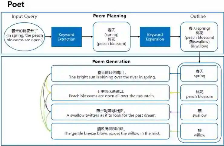 举个例子,如果用户想要写一首和春天有关的诗,那么诗歌规划模型就会首先生成一个内容概要,包括春天,桃花,燕和柳这四个主题,然后由RNN模型根据这四个主题生成四句诗,来完成整首诗歌的创作。