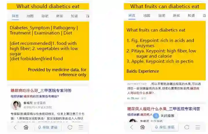 比如,用户可以搜索“糖尿病患者应该吃什么”,那么系统则会回答“饮食建议、饮食禁忌”等内容。这些信息来自于网上的医疗领域数据,经过信息挖掘和匹配,生成答案呈现在用户面前。