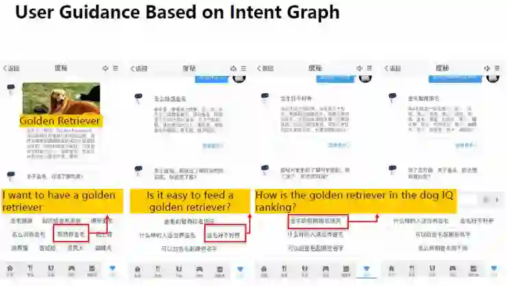 用户想要查询关于“金毛”的信息,基于意图图谱,度秘提供给用户关于金毛的一般信息;接着进入第二轮,用户点击了“我想要一只金毛”的选项,度秘便可以猜测用户接下来会想要知道“如何喂养一只金毛”、“什么样的人适合养此类犬”等信息,并将这些引导项展现给用户。然后用户点击了“喂养一只金毛容易吗”的选项。对话进行到此轮,用户的需求基本被满足了。