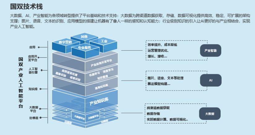 最后我想说一句,我们有一个理念,就是希望利用这些能力为各行各业赋能。每个行业、每个企业都会生产一个产品或者提供一个服务,这个过程也有一个价值链,在这个价值链里有很多环节,不管是设计产品、定义产品,还是生产这个产品、营销这个产品,国双具有的大数据和人工智能的能力都可以为这些产品和企业提供相应的解决方案。