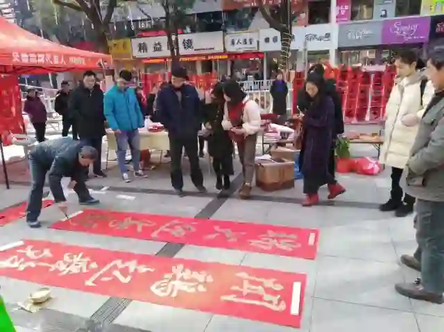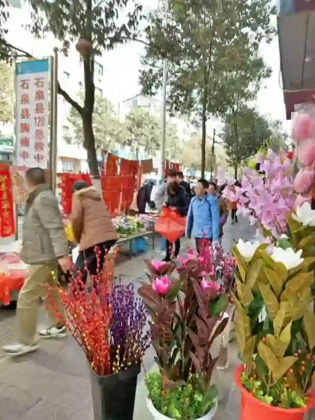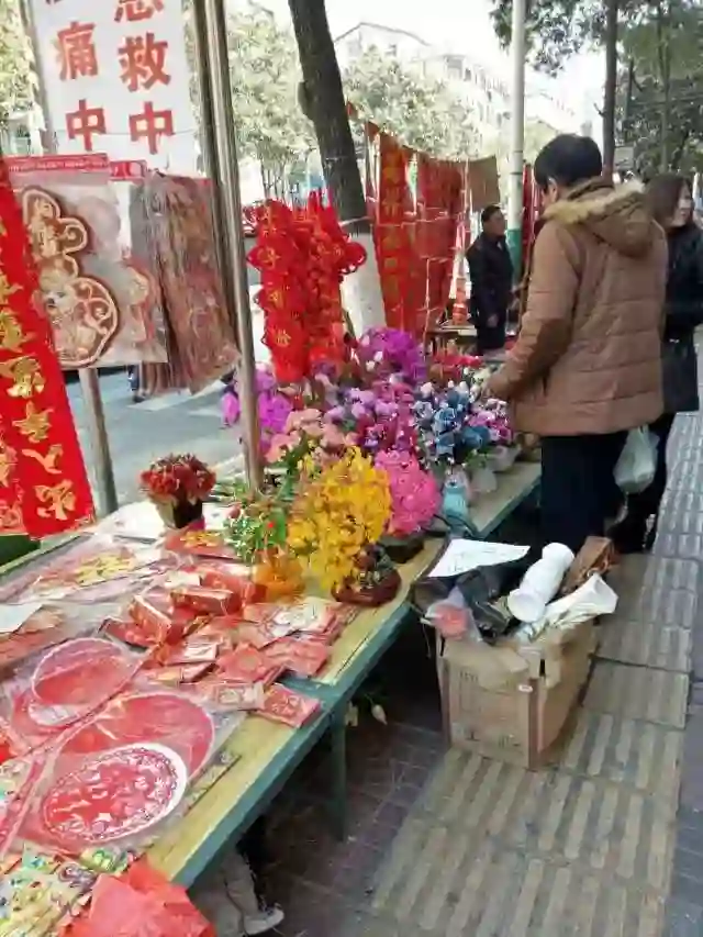 各种卖对联、福字、烟花爆竹、鲜花、灯笼、门神等等充满了年味儿的物件儿簇拥在街道上。