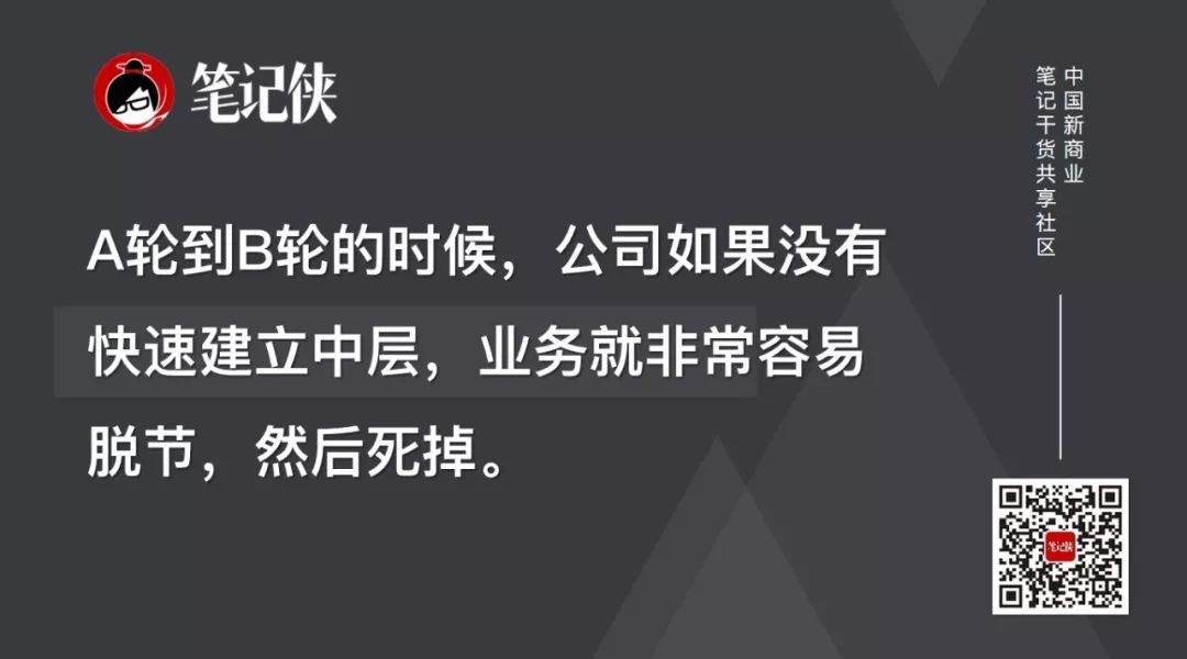 公司刚开始的时候都是几个创始人或者合伙人带着一帮孩子一起干,如果A轮到B轮的时候没有快速地把中层,比如总监这一级的人补齐的话,业务可能就会出现断层,战术层面可能就不能支持你再爆发。