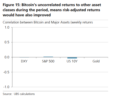 瑞银又比较了比特币与其它资产类别的平均关联度。研究发现,如果把数字货币视为一个资产类别,与股票、债券等传统资产类别的关联性是非常低的,几乎可以忽略不计。瑞银指出,也正因此,因此,比特币能够被用于多元化投资。