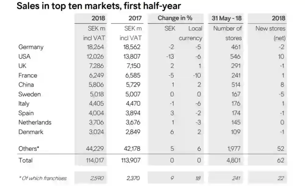 促进销售或处理存货,无外乎营销活动和打折手段,2018上半年其毛利率为53.2%,比去年同期54.7%下降1.5个百分点,显然H&M降低了售价。