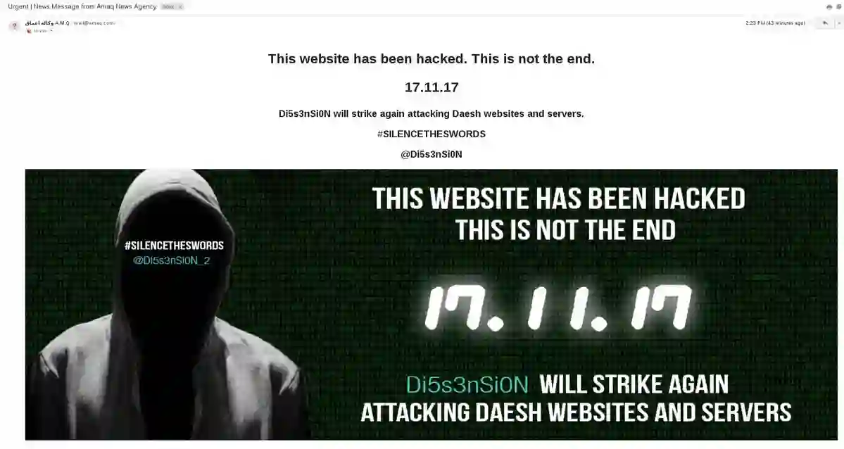 在接管网站后,黑客通过该网站的官方电子邮件地址mail@amaq.com向用户发送了一些电子邮件,显示了一个戴头巾的男子和一条信息。
