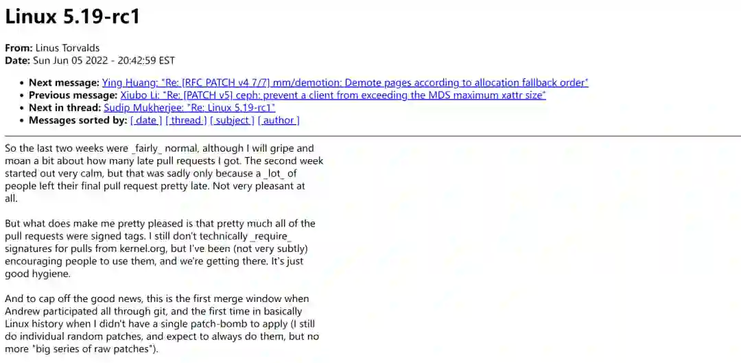 2022 年 6 月 7 日,Linus Torvalds 重磅发布了 Linux 5.19 的首个候选版本,此版本的到来成为 Linux 多平台开发的一个里程碑事件。