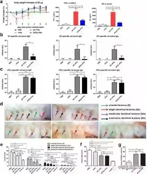 第二代重组融合蛋白抗龋疫苗—KFD2-rPAc大大降低了可能的系统性炎症反应(a)、鞭毛素本身的免疫原性(b)、但保留了良好的诱导rPAc特异性免疫应答的能力(c)以及高效的抑龋活性(d-e)。