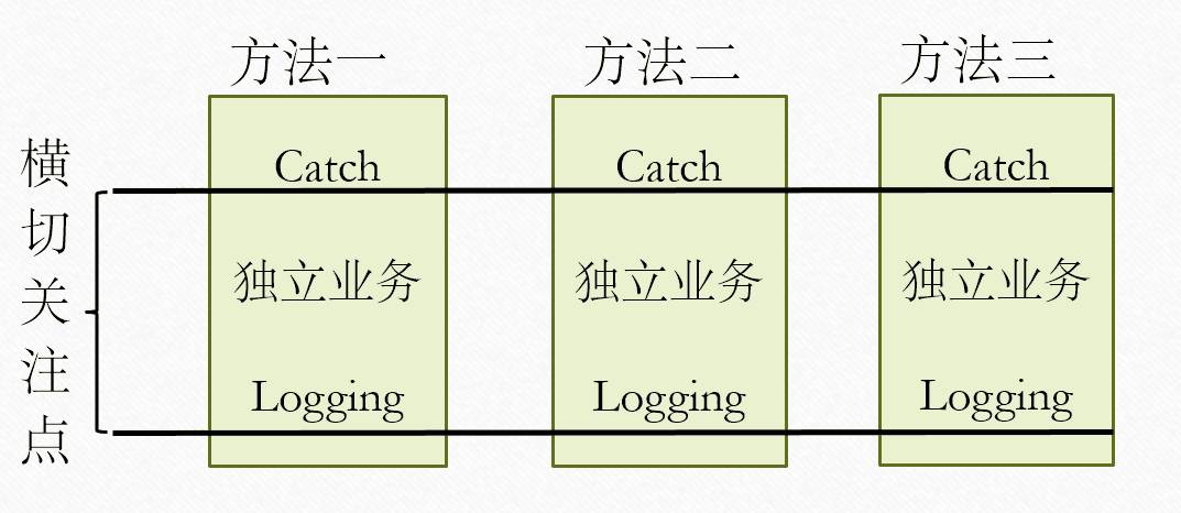 横切关注点:存在于项目的绝大多数业务中可以通用的一些辅助性的功能。例如日志、安全、持久化等模块。它们存在于核心业务代码块的各个地方,却又独立于这些核心业务逻辑。