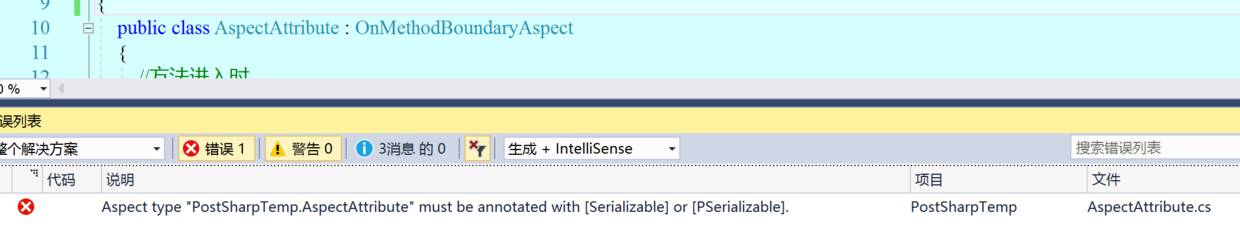 7、有一个小点需要注意,使用postsharp的时候对切面类必须添加Serializable特性,否则在编译的时候就会报错。