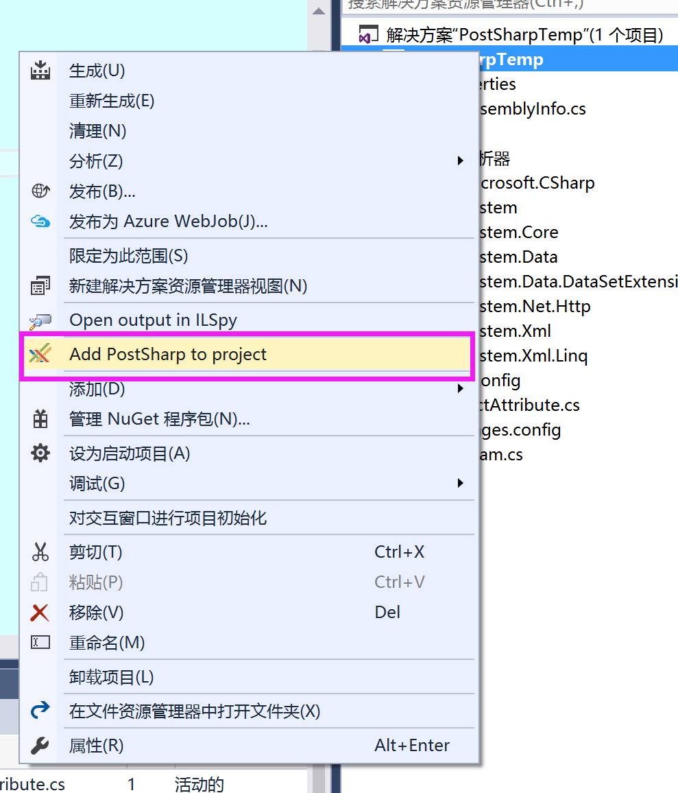 但是3.0之后是类似于VS插件的方式工作的,下载postsharp安装包安装之后会在vs的菜单中新增一个postsharp菜单(如下图),可以进行一些设置,在使用的时候不再是引用,而是需要项目上右击“添加postsharp到项目”
