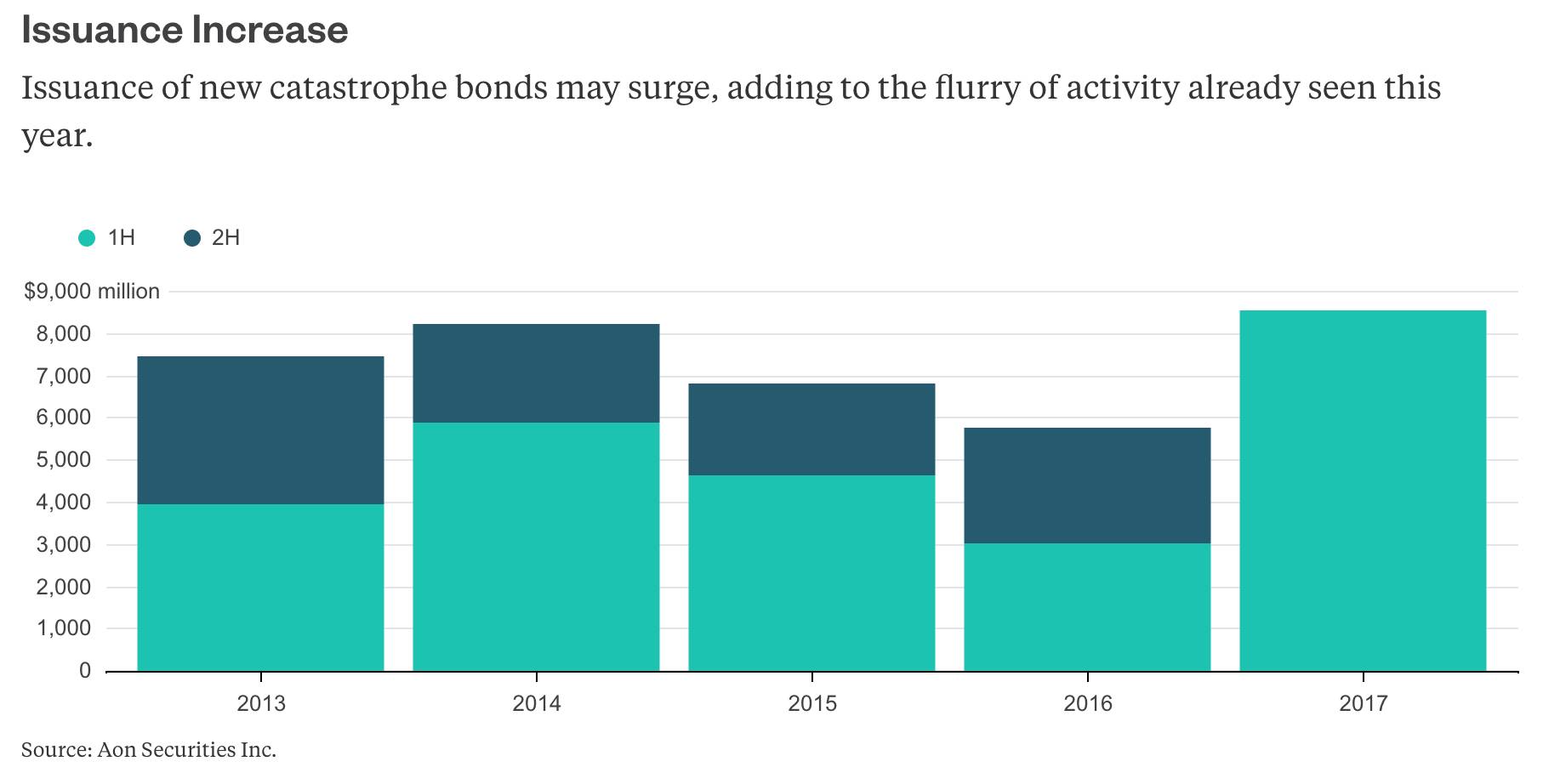 鉴于2017年的众多灾害事件,新巨灾债券的发行量增加