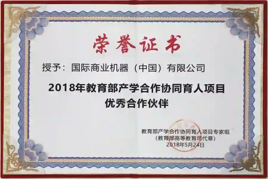 在2018年5月举行的教育部产学合作协同育人项目对接会上,IBM被教育部高等教育司授予“教育部产学合作协同育人项目优秀合作企业”称号,与上海交通大学合作开展的“基于企业慕课和翻转课堂的数据科学训练营”项目获评“十大优秀案例奖”。