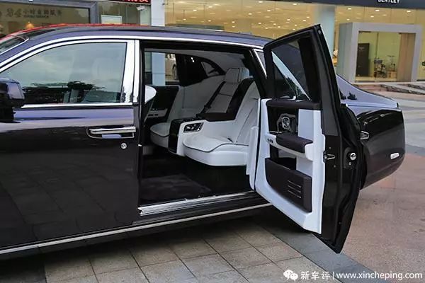 后车门的开启方式还是很经典的仿马车式对开式设计,为了防止身着晚礼服的女士走光,后门的门壁板里依然配备了一把价值在 10 万元左右的雨伞来遮挡,而且雨伞的颜色是和车厢里的颜色是一致的,比如我们这台车厢内是紫色和白色的搭配,伞面就是紫色和白色的。
