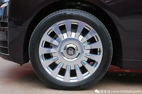 轮圈是目前民用车里尺寸最大的 22 英寸轮圈,具体尺寸为 255/45 R22。轮胎用的是马牌的 CSC5 系列自修复轮胎,它用的轮胎可不是市面上随便买的,也是劳斯莱斯定制的,车内有特殊泡沫层来吸收轮胎噪音,据官方数据轮胎噪音相比老一代车型降低了 9 分贝。
