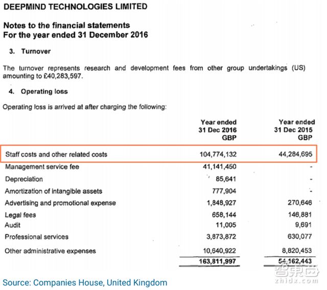 ▲DeepMind2016年财报表:员工成本和其他费用为1.048 亿英镑,领英显示其员工人数仅为 415 人