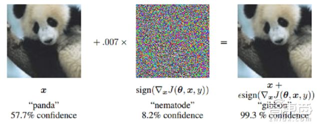 ▲CNN在人工噪音下将熊猫图片(置信度57.7%)错认为长臂猿(置信度99.3%)