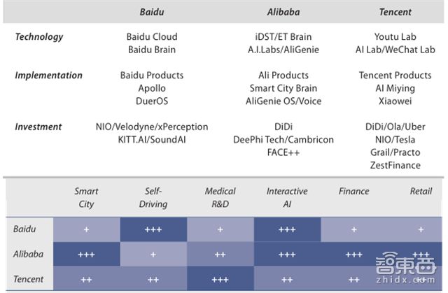 从创业方向来看,中国比较活跃的领域是面部识别(相关创企包括独角兽旷视科技/Face++、商汤科技,以及广州市政府3.01亿美元资助的云从科技)和人工智能芯片(寒武纪)。面部识别获得了全国范围的智能安防计划的支持,AI芯片则直接挑战美国的芯片制造。