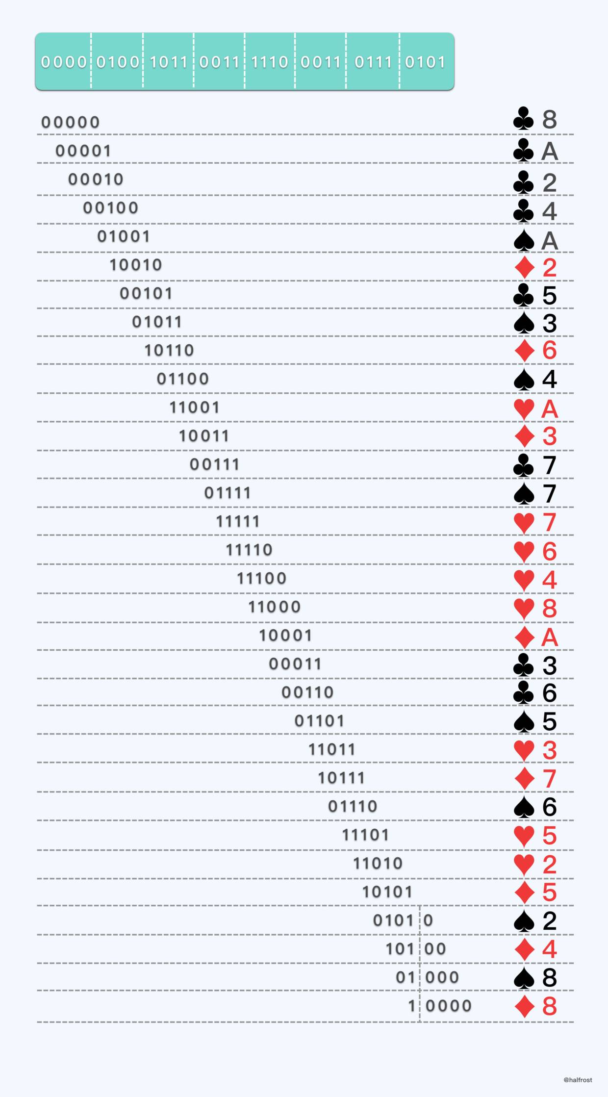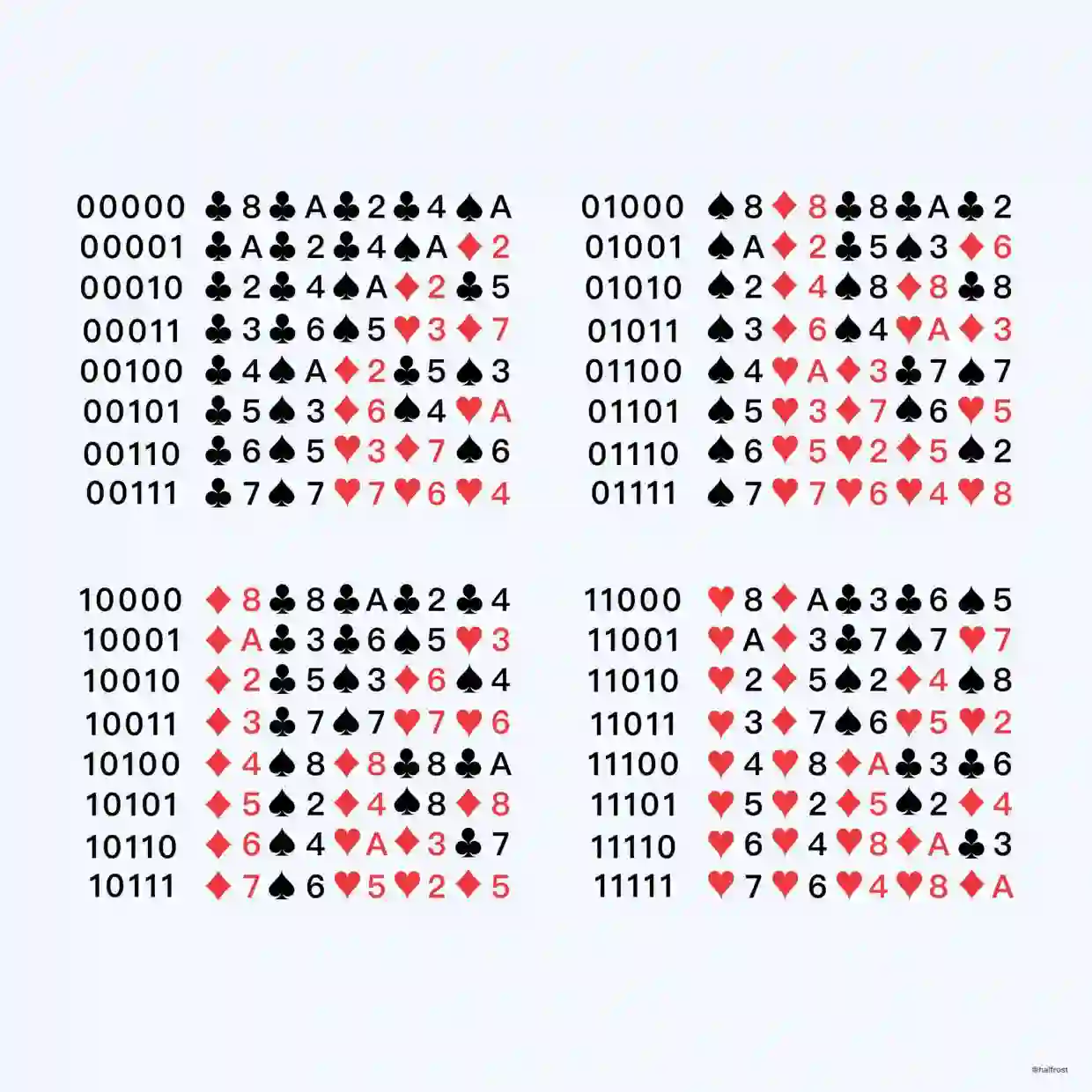 将窗口大小为5的德布鲁因序列每5个二进制位都转换成扑克牌的编码,如下: