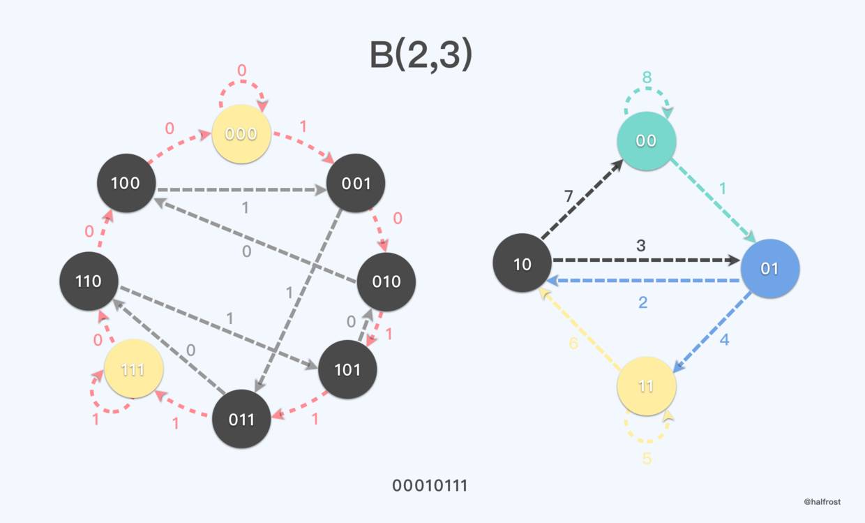 例如,序列 00010111 属于B(2,3)。 00010111 的所有长度为3的子序列为000,001,010,101,011,111,110,100,正好构成了 {0,1} 3 的所有组合。