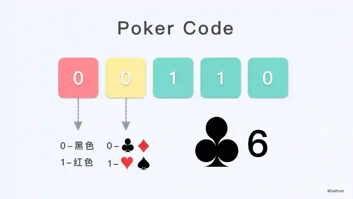 如上图,00110 表示的就是梅花6 。11000 表示的是红桃8(因为没有 0 号牌,所以000就表示8)