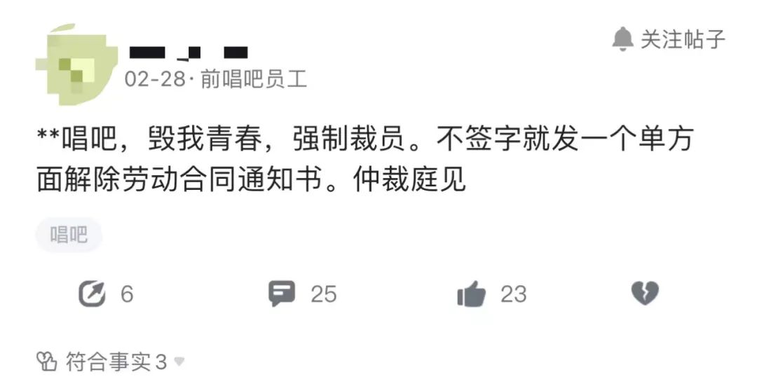 唱吧这一手操作大概是想省点钱,结果被裁员工并没有“买账”,没人愿意签字,还有前唱吧员工表示要和唱吧“仲裁庭见”。