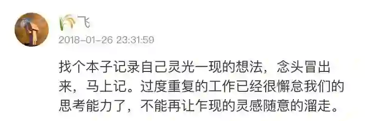 何似:现在的手机也很方便记录这些灵光一现的想法。其实用什么记不重要,重要的是我们要有意识,记下自己的灵感。相信我,过后你在看到它们,自己都会有惊喜的感觉。
