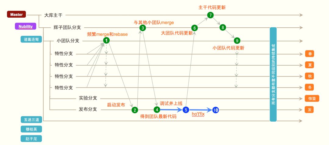 分支:分支尽量的少,分支越多持续集成越没意义,merge成本越高,团队分支最多也不能超过下图